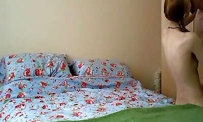 Anorexia pigtailed ginger-haired girl has missionary, doggy-style and cowgirl sex with creampie on the bed.