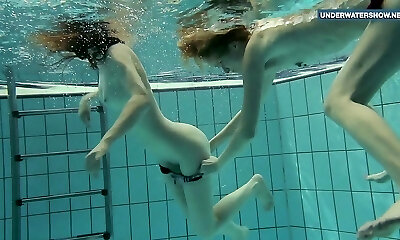 Two spectacular girls swimming naked in a pool