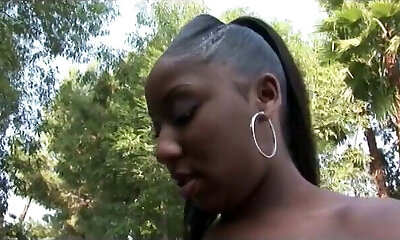 Chocolate bitch with round ass is riding prick outdoor