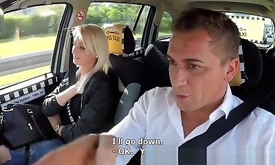 Timid passenger cheats on his Girlfriend with naughty blonde taxi driver
