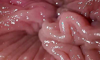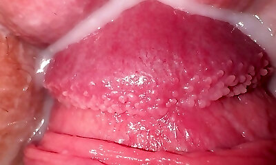 Breathtaking model is flashing off her stretched narrow slit in macro shot